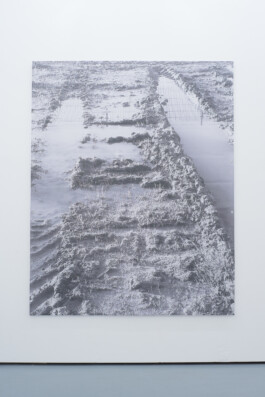 Erde, geformt von einem schweren landwirtschaftlichen Gerät. Der Traktor hinterließ bei einer Fahrt über die Weide zwei ungleichmäßige Furchen im Abstand der Radachsen. Über Nacht wurden sie mit Regenwasser gefüllt. Der Matsch ist so angehäuft, dass er sich an manchen Stellen über den Wasserspiegel erhebt. Erst kürzlich wurde dieses vertraute Bild einer zerfahrenen Schlammwiese durch die Spiegelung eines Zaunes mit Stacheldrahtapplikation ergänzt.